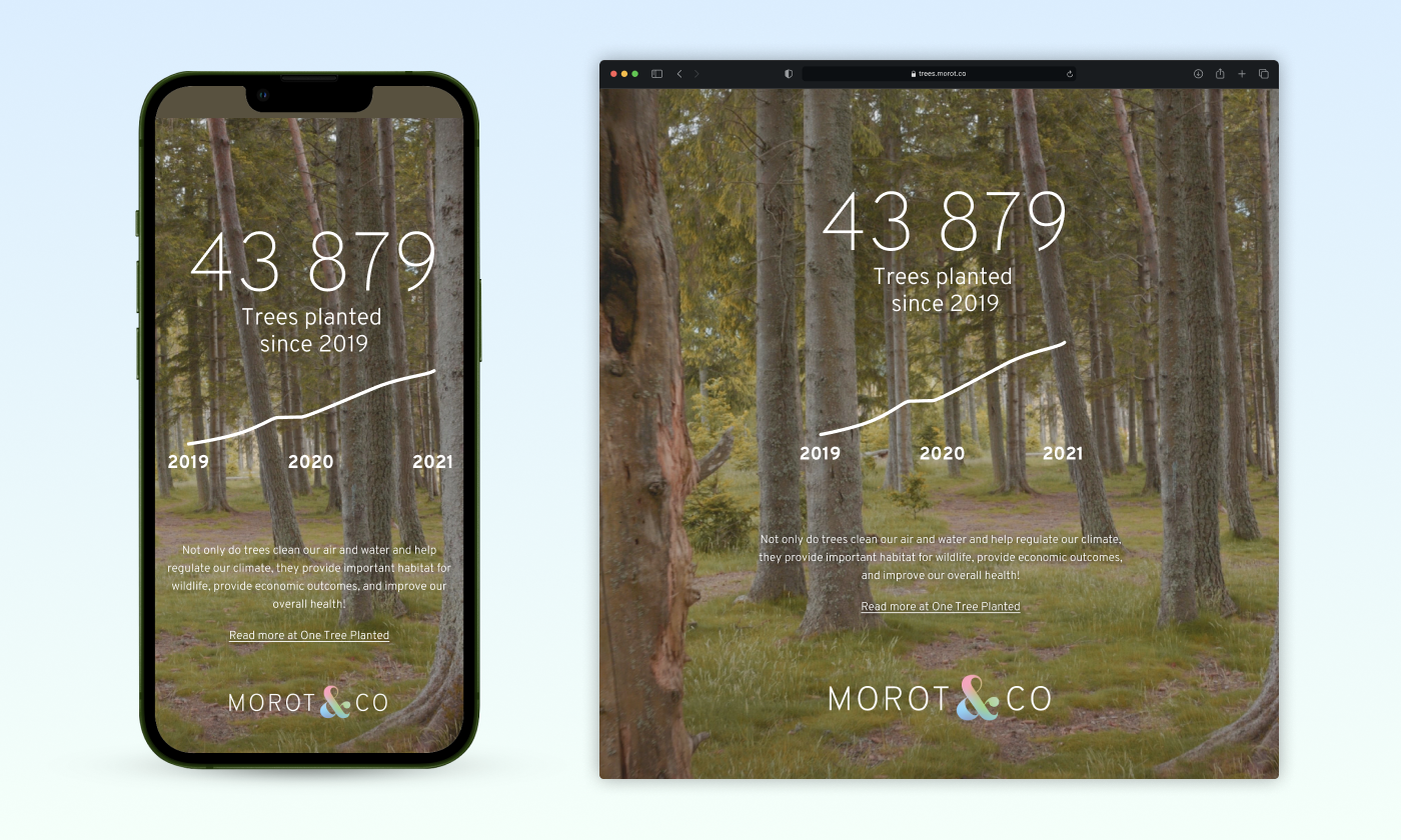 Morot & Co have been offering tree planting since 2019, in campaigns where they plant a tree for each sold gift card. Users are also able to choose tree planting as their gift when they redeem the card. To encourage the customers and be able to show the progression, this tree counting page was made. It is simple but catches attention with a video of a stroll through a forest in the background.